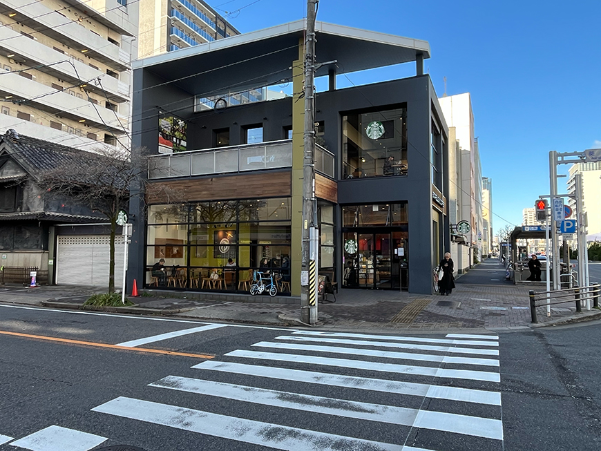 ▲横断歩道を渡ってすぐ向かいにはスターバックス。